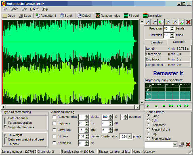 Program is using for all calculation 32 bit representation of sound, which warrants dynamics of 240 dB in integer numbers and till 1667 dB in floating point numbers. This warrants after conversion back to output 16 bit format non-measurable calculation losses. Also frequencyprocessing through FFT (FAST FOURIER TRANSFORMATION) with block size 16384 samples on channel warrants high frequency accuracy. Method of noise autodetection noise requires that recordings consist of at least one place only with noise about length at least one second, otherwise it can reach the removal of also other sounds than noise so damage recordings. Unfortunately I am not conscious of that, that at present it subsists method of detection noise from sample, where there are not places with noise in clear form. Diferently from most of the programs there is not a need to search noise manually and the program finds noise. Due to 32 bit processing there is no possibility to "overburn" the signal, if peaks exceed behind borders of normalized signal, there're not otherwise displayed, but after normalization of signal they are back available distortionless. If you however sample save with overrun peaks,they will be cutted. |